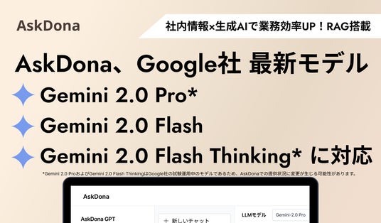 株式会社GFLOPS(本社:東京都渋谷区、代表取締役CEO:盛本マリア、共同代表:鈴木亮祐)は、法人向けChatGPT活用プラットフォーム「AskDona」のGPTチャット機能において、Google社の最新LLM(大規模言語モデル)「Gemini 2.0 Pro」「Gemini 2.0 Flash」「Gemini 2.0 Flash Thinking」に対応したことをお知らせいたします。