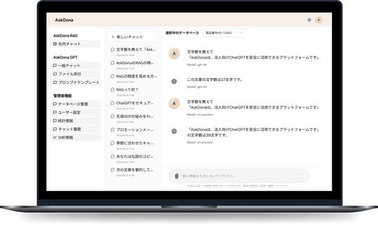 AskDonaは、企業の生成AI活用における課題を解決するプラットフォームです。セキュリティに配慮した法人向けが利用しやすい環境を提供しており、企業独自のデータを追加学習させることで、より精度の高いAI活用を実現できるRAGチャットと一般的な知識や推論モデルより回答をすることができるGPTチャットが機能として備わっています。