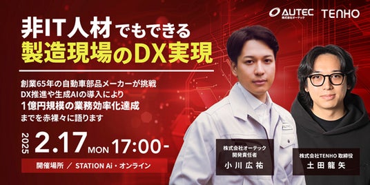 生成AIに関する研修・内製化支援事業を展開する株式会社TENHO(本社:東京都渋谷区、代表取締役:田村 允)は、STATION Aiとオンラインにて、製造業DXに関するセミナーを開催します。