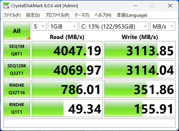 ストレージのデータ転送速度を測定できる「CrystalDiskMark」では、シーケンシャルリードが4000MB/s前後となった。SSDの読み書き速度は、OS/アプリの起動にかかる時間や大容量データの処理に要する時間に影響するため、使い勝手の良さが分かる指標になる。この結果であれば、OSやアプリが素早く起ち上がり、大容量ファイルも読み書きできる。