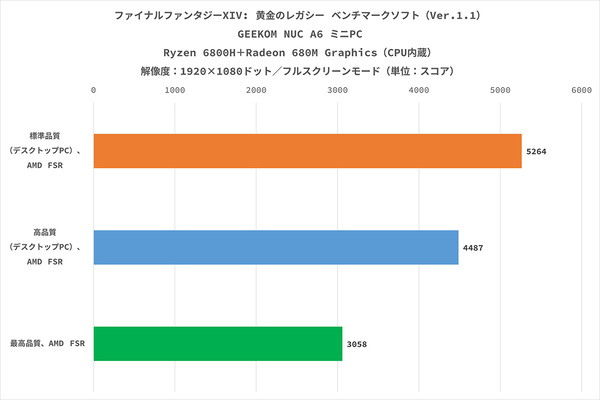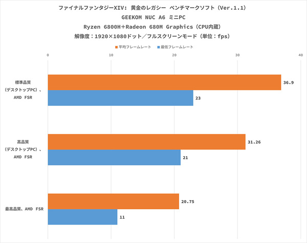 最後は、より実際のゲーム環境に近いベンチマークとして「ファイナルファンタジーXIV: 黄金のレガシー ベンチマーク」(以下、黄金のレガシー)を試した。ただ、AMD Radeon 680M GraphicsのようなAMD製GPUの場合、黄金のレガシーなどのベンチマークソフトではフレームレートを正確に計測できないので、参考程度の情報としてほしい。AMDのフレーム生成技術「AFMF 2」は、ゲームからの映像をもとにフレームを新たに生成することでフレームレートを高める仕組みになっており、実際のプレイ時にはベンチマークの数値よりも快適に感じるだろう。