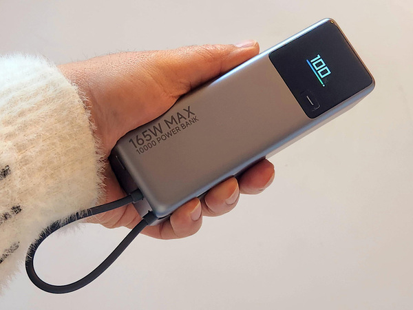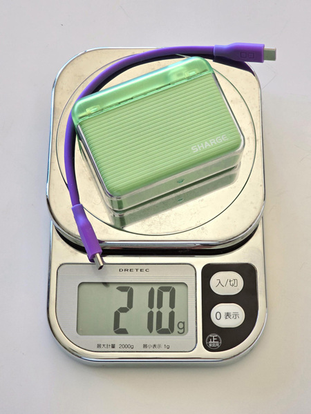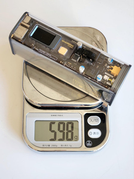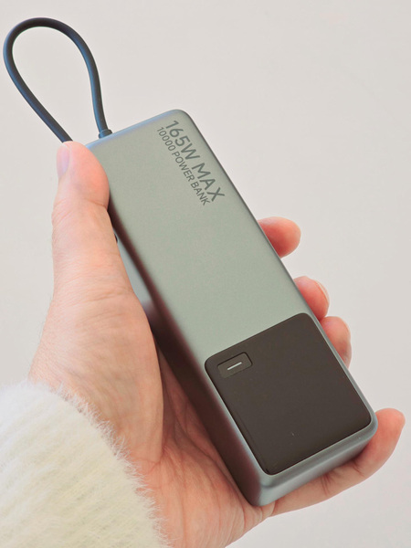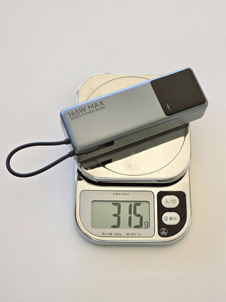3000mAhで超薄型実測83gの製品から、25600mAhの重量級の実測598gのものまで、ほぼ容量に正しく比例して重量が増えていく。今回の165W Power Bank 10000は実測315gで、重量だけを捉えれば妥当な製品だ。しかし10000mAhというイメージにしては、サイズは少し大きく、それゆえかえって手に持ったときは軽く感じるから、人の感覚とは結構いい加減なものだ。