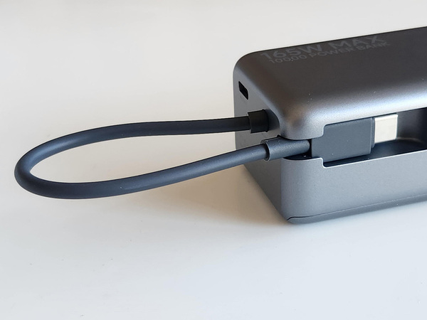 165W Power Bank 10000はType-Cの短いケーブルがストラップとして内蔵されている。パッケージ内の同梱物は取説と安全ガイドのみ。ストラップ兼内蔵USBケーブルを引き出すと実測で長さ15㎝だった(プラグ部含まず)。スマホやタブレットをテーブル上の近接距離で充電するには十分な長さだ。