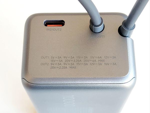 充電・給電の接続端子となるType-Cポートは2個ある。内蔵Type-Cケーブルはポート1の「IN1/OUT1」となる。そしてオープンなもう1つの端子はポート2「IN2/OUT2」となる。いずれもスマホへの給電と自身の内蔵リチウムイオン充電池への充電が可能となっている。ポートごとの入力、出力のスペックは本体ポート下の記述を参照されたい。