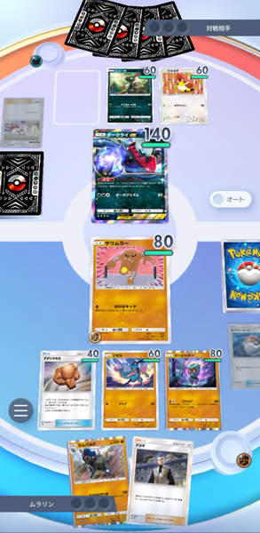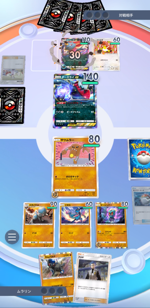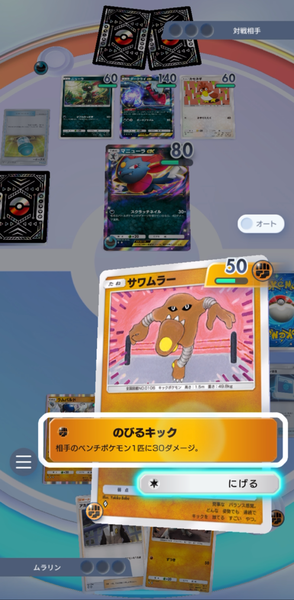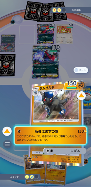 ベンチにルカリオがいれば、ラムパルドの攻撃は150ダメージも出せるので、HP満タンのマニューラやダークライもワンパンできる。とはいえ、万全を期すなら先にサワムラーで相手の高HPポケモンのHPを削っておけるといい