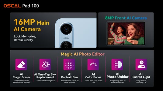さらに、16MPメインカメラで鮮明な思い出をキャプチャし、8MPフロントカメラはセルフィーや顔認証に対応。OSCAL Pad 100は、誰でも簡単にプロ並みの写真編集ができるタブレットとなっています。