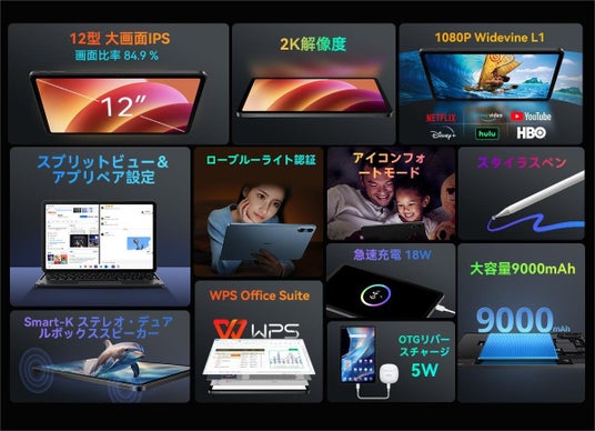 12インチ2K IPSディスプレイ&低ブルーライト認証&Widevine L1対応&デュアルSmart-Kボックススピーカー