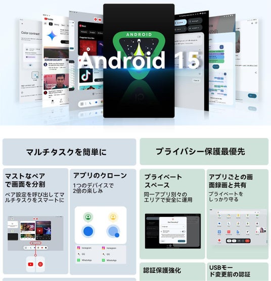最新OSのAndroid 15を搭載しており、プライバシー保護機能、マルチタスク機能など、ユーザービリティを向上させる便利機能を豊富に用意。キーボード対応により、ラップトップPCのような使い方も可能です。