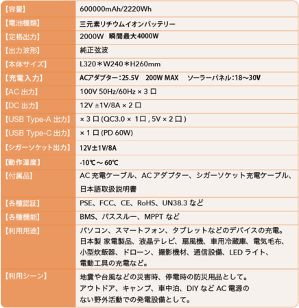 今回のプロジェクトに向けて当社は、定格出力2000W(瞬間最大出力4000W)、バッテリー容量2220WH(600000mAh)とこれまでにない超大型出力・超大容量のスペックを実現させた。