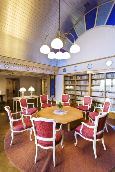 もうひとつ紹介したいのが優雅な“サロン”。書棚には大佛次郎の初版本がズラリと並びます。書棚の上には、生まれ故郷の港町・横浜にちなみ、船窓風の装飾が。中には開花期の横浜の浮世絵が。横浜港を一望しながらゆったりとした時間を過ごせる場所となっています。