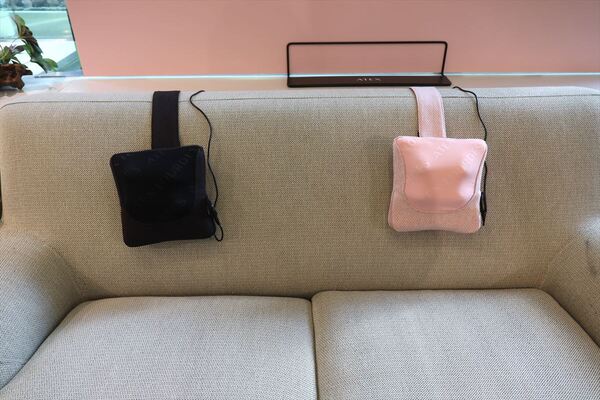 新製品1つ目は、アテックス史上最小・最軽量の「マッサージクッション XS」(直販価格7700円、2月25日発売)。幅200×長さ200×高さ90mm、重さ約900gで、使わない時にはソファの隅に置いても邪魔にならず、移動も楽。小さいこともさることながら、一番のポイントは「もみ位置調整ベルト」がついていること。これまでのマッサージクッションは、ソファの背もたれに押し付けて使う場合、肩や肩甲骨周りなど好みの位置に調整するのが難しく、また、使っているうちにマッサージクッションの自重でずり落ちてしまうのが難点だった。