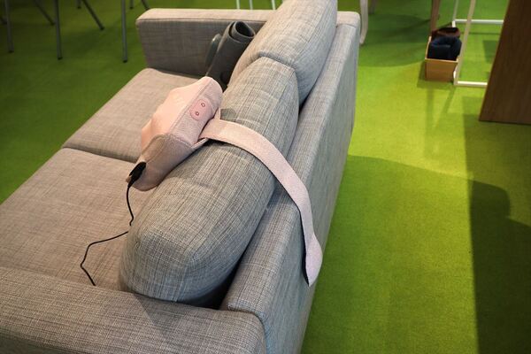 新製品に搭載されている「もみ位置調整ベルト」は、先端に重りが入っており、さらにベルト裏側に滑り止め加工しているため、ソファや椅子の背もたれに引っ掛ければマッサージクッションを好みの位置にピタッととめることができる。肩甲骨、背中、腰と、気になる部位を的確にもみほぐせるのである。マッサージしたい箇所にうまく当たらず、体をもぞもぞ動かすストレスから解放されるのは嬉しい。