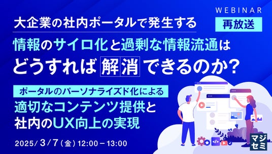 マジセミ株式会社は、大変好評をいただいた「【再放送】大企業の社内ポータルで発生する情報のサイロ化と過剰な情報流通はどうすれば解消できるのか?」というテーマのウェビナーを再放送します。