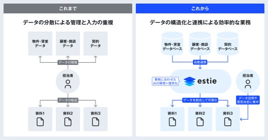 また、必要なデータを整理・蓄積することにより分析可能な環境を構築し、estieが保持する独自のAI技術を活用しながらオフィスリーシングの幅広い業務の自動化・高度化を目指します。