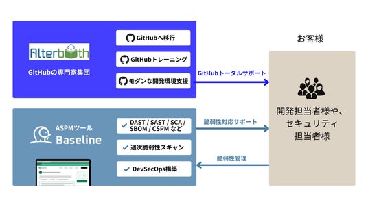 本連携を通じ、ASPM「Baseline」のお客様に対し、オルターブースがGitHub導入支援(データの移行や運用サポートを含む)を行うことで、開発体験向上及びセキュア開発の実現に寄与いたします。