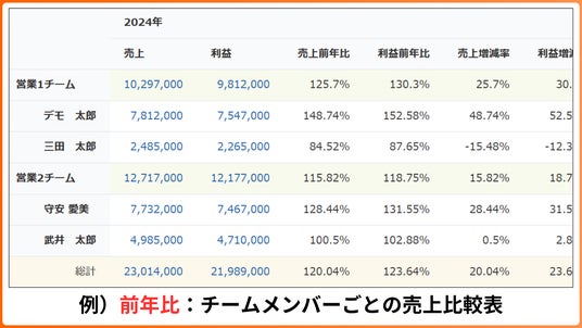 機能強化 集計機能(前年比集計)同じアプリ内にあるデータを使って、集計表に前年、前月、前年同月の値や比率などの表示が可能です。