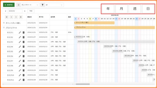 新機能 ガントチャート ビュー多くのお客様から要望のあったプロジェクト管理や進捗管理ができる機能です。プロジェクトとタスクを同時に表示して進捗を一目で把握できます。年、月、日単位の表示切替もできます。