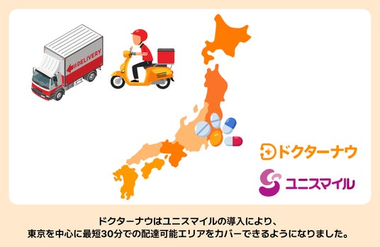 ユニスマイル薬局を運営する株式会社ユニスマイルは全国28都道府県で保険薬局を展開しています。2024年12月2日より、東京23区内のユニスマイル薬局7店舗でドクターナウが導入されました。これにより、同エリアのドクターナウユーザーは、オンライン服薬指導後最短30分以内に処方薬を受け取ることができるようになります。