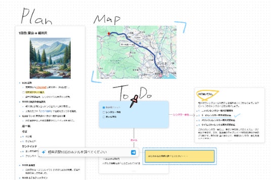 自由なキャンバス上でメモや画像を配置、マインドマップやストーリーボードとして活用可能。他のメンバーとの共同作業にも対応。