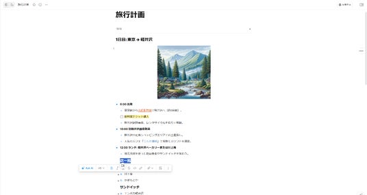 多くのオンラインメモサービスと同様に自由に文章を書けます。画像の挿入や箇条書き、URLリンクはもちろん、ToDoリストやデータベース、プログラミングコードなども追加できます。見出しなどのスタイルの設定もでき、目次も自動で生成されます。日記モードも搭載しているので、日記帳として日々の記録にも使えます。