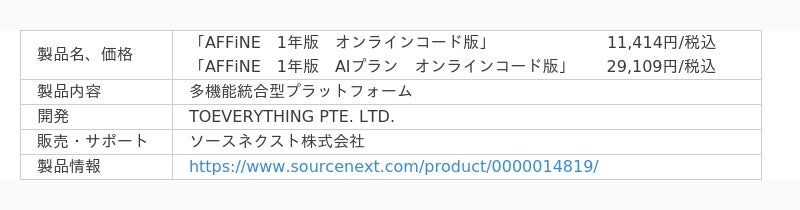 ソースネクスト株式会社(本社:東京都港区赤坂1-14-14 第35興和ビル4階 代表取締役社長:小嶋 智彰)は、2月17日(月)より、次世代の統合型作業プラットフォーム「AFFiNE 1年版」(11,414円)、「AFFiNE 1年版 AIプラン」(29,109円)を弊社サイト上で発売いたします(いずれも税込、ダウンロード版)。