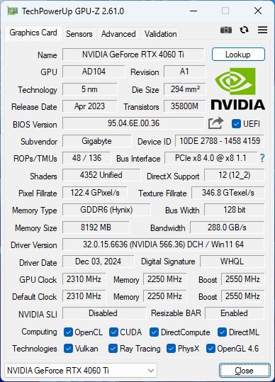 GPUはRTX 4060 Tiで、試用機にはGIGABYTEの「GeForce RTX 4060 Ti WINDFORCE OC 8G」が装着されていた。このカードは、ブーストクロックが2550MHzに引き上げられたクロックアップモデルで、90mm角ファンを2基搭載した「WINDFORCE」と呼ばれるオリジナルクーラーを採用。