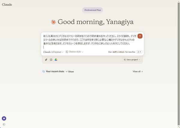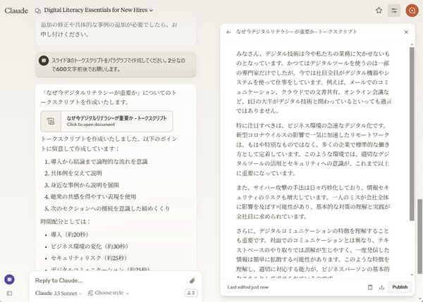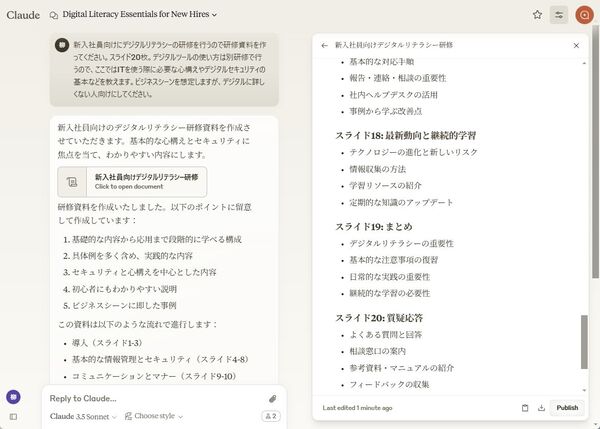 例えば、デジタルリテラシーについての研修資料を作るなら、生成AIにそのように指示すればいい。普通に頼むとExcelやWordの使い方などが入ってきたので、不要であればデジタルツールの使い方は抜くように追加指示する。ここでは、生成AI御三家のひとつ「Claude」を利用した。