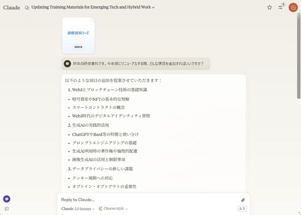先輩が実施した研修の資料を引き継ぎ、今年度版を作ることもあるだろう。もちろん、そのブラッシュアップにも生成AIを活用できる。とは言え、試しに、Claudeに昨年の研修資料を入れて、リニューアル項目を考えてもらったところ、少々古い内容が返ってきてしまった。