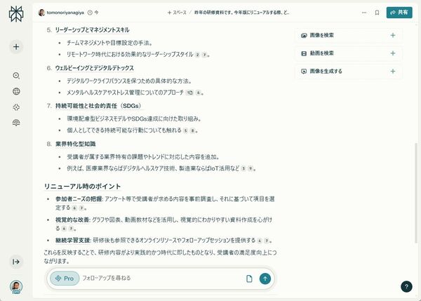 やはり、最新情報を扱うなら検索機能を利用する必要がある。今回は「Perplexity」という検索特化型生成AIサービスに昨年のワード資料をアップロードし、ブラッシュアップさせてみた。