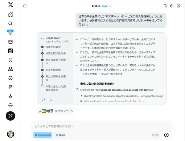 2025年2月18日にイーロン・マスク氏が率いるxAIは最新のAIチャットボット「Grok 3」をリリースした。約20万台のGPUを使って92日間にわたる学習を実施した結果、数学や科学分野、さらにはプログラミングの問題解決においても飛躍的なスピードと精度を実現している。リアルタイム検索機能「Deep Search」を搭載し、Xとの連携を通じて最新情報を素早く取り込み、指定のハッシュタグやトピックに応じた回答を瞬時に生成できる点もユニークだ。料金プランは当初XのPremium+加入者(月額40ドル)のみがフル機能を利用できるはずだったのだが、2月20日からは無料アカウントにも開放された。ただし無料ユーザーには2時間ごと最大10回のメッセージ送信、1日3件までの画像生成といった制限が設けられ、「サーバーがパンクするまで」提供されるとのこと。今後は月額30ドルの「SuperGrok」プランが導入され、優先アクセスや追加機能などの特典が得られる見込みだ。