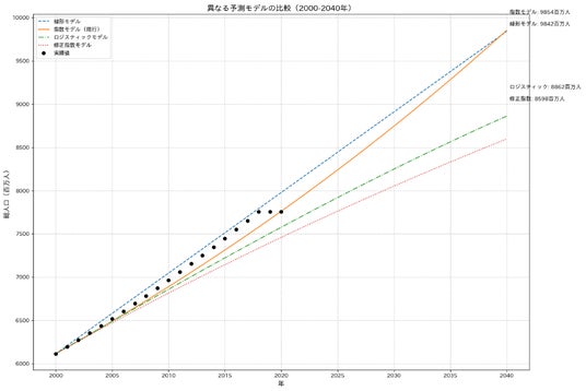 ※世界の総人口の今後の予測を、複数の数式で計算し、比較させた結果