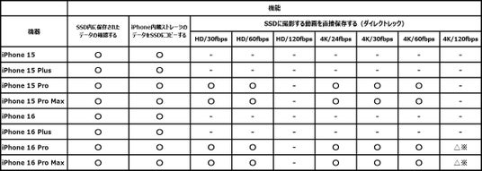 〇:対応 △:一部のモードに対応 ×:非対応 ―:iPhoneに機能なし ※録画書き込み速度が不足し、録画停止になる場合があります