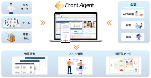 「Front Agent」は、新人からトップセールスを輩出するコネクテッドセールス・プラットフォームです。Web会議・対面・電話の会話から自動的に 商談アシストAIが議事録を作成。リアルタイムに話すべき内容をレコメンド、話者心理分析、会話された文脈を可視化するディープインサイトエンジンを活用しています。