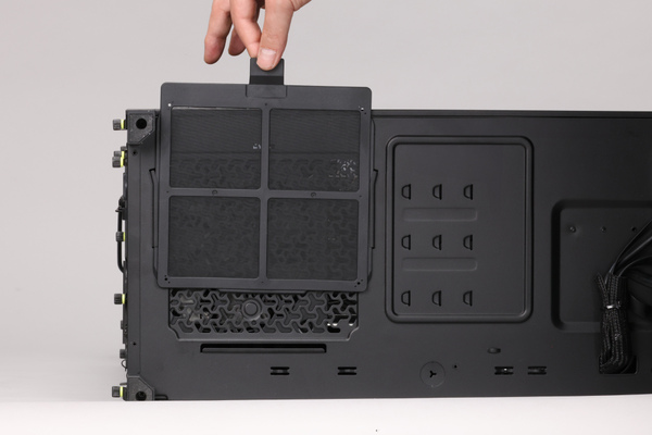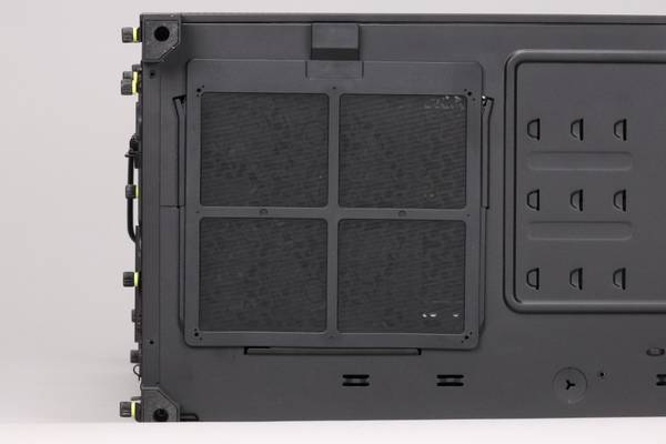 また、通気性を重視したケースにありがちなのが、ホコリが内部に侵入しやすいこと。これを軽減するため、前面パネルの内側だけでなく、ケース底面、電源ユニットの吸気口にもフィルターが装備されている。