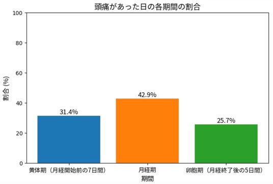 自己申告による月経期間と照合したところ、頭痛が最も多く発生していたのは月経期であり、次いで黄体期でした。