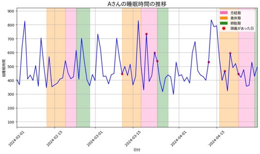 また、「頭痛があった」と自己申告があった日は赤い点で示しています。