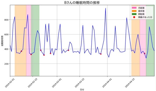 Aさんのグラフからは、頭痛が発生している日の大半が月経期または黄体期に当てはまることが確認されました。ただし、頭痛の有無と睡眠時間の増減に明確な関連性は見られませんでした。