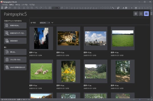 スタート画面では、過去の編集ファイルを一覧できます。更新日時や参照日時、サイズなどで並べ替えが可能。サムネイルの有無や大きさも選べます。