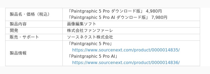 ソースネクスト株式会社(本社:東京都港区 代表取締役社長:小嶋 智彰)は、2月18日(火)に、弊社サイト上で画像編集ソフト「Paintgraphic 5 Pro」(4,980円)と「Paintgraphic 5 Pro AI」(7,980円)を発売いたします(いずれも税込、ダウンロード版)。
