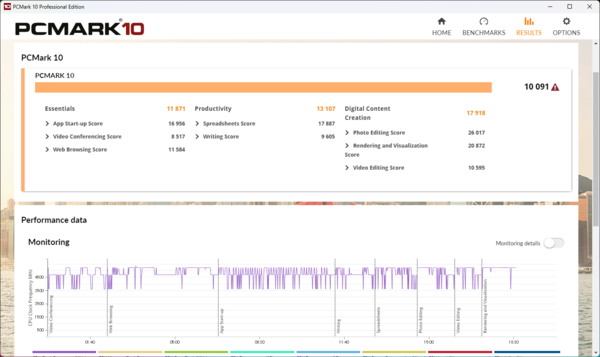 総合スコアーは10091で、その内訳はアプリ起動速度、ビデオ会議、Webブラウジングの性能を測る「Essentials」が11871。表計算や文書作成のオフィスソフト性能を測る「Productivity」が13107。写真編集や動画編集、3DCG製作などのクリエイティブ性能を測る「Digital Content Creation(DCC)」が17918を記録した。