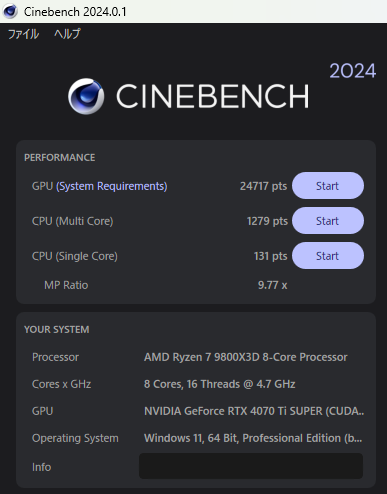 まずは3DCGのレンダリングを通じてCPUのマルチスレッド/シングルスレッド性能を計測する定番の「CINEBENCH 2024」から。