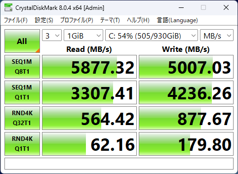 結果はシーケンシャルリード5877MB/s、シーケンシャルライト5007MB/s。PCI Express Gen4接続としてはミドルレンジの性能と考えていいだろう。十二分に高速でWindowsの起動やゲームのローディングでも不満を感じることはなかった。
