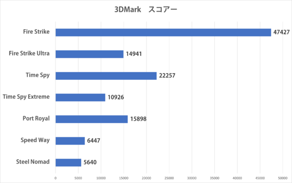 フルHDベンチマークのFire Strikeがスコアー47427とかなり高スコアーを記録している。比較としてGPUに同じくRTX 4070 Ti SUPERを搭載しCPUが「Core i7-14700F」のゲーミングパソコンの場合、Fire Strikeスコアーは約43600だったので、CPUの違いだけで約8~9%ものスコアー差が出たことになる。フルHD解像度ではCPU性能の差が大きく表れるということを改めて確認できた格好だ。