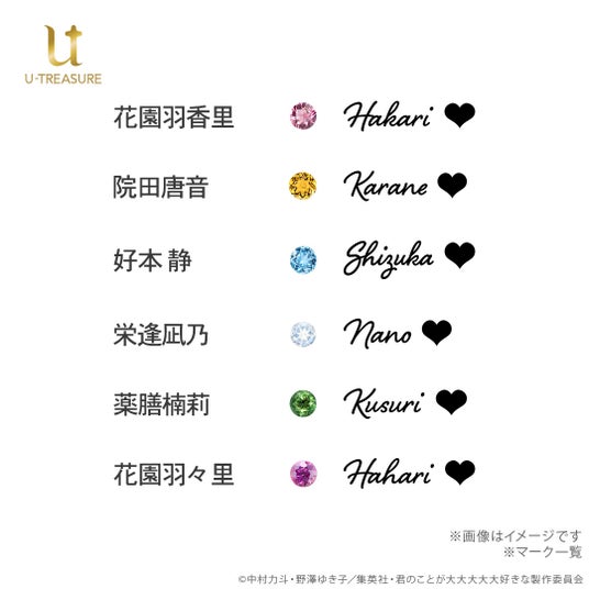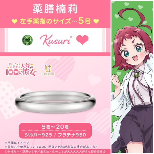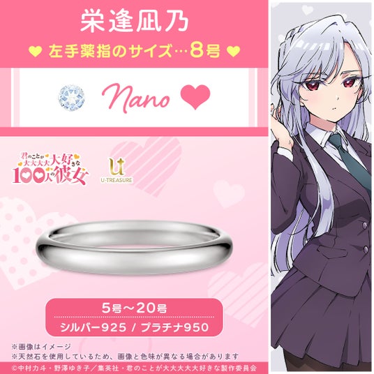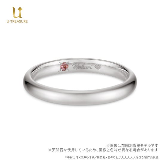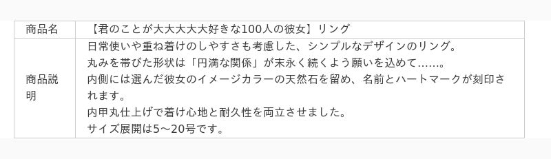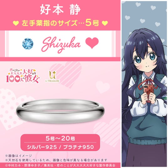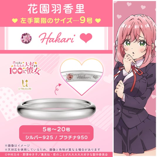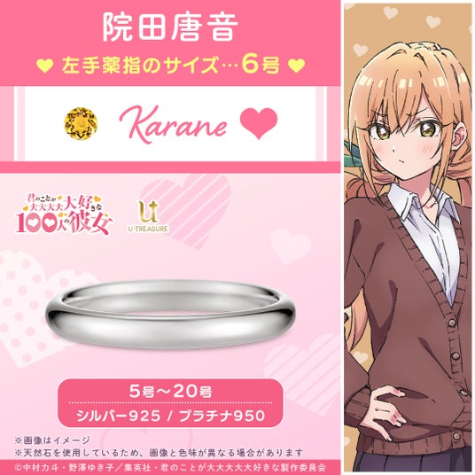 【君のことが大大大大大好きな100人の彼女】リング(指輪)の内側に彼女の名前の刻印と、イメージカラーの宝石が輝くデザイン。3月18日(火)まで予約受付