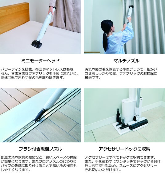 使い勝手にこだわった付属の豊富なアクセサリーで、床や家具の上だけでなく、布団やマットレス、狭い場所やすき間、ソファなど、家じゅうの様々な場所をお掃除できます。
