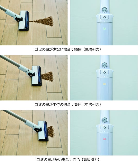 吸引するゴミの量に応じて、ハンディ上部のiQアイコンの色が緑色、黄色、赤色の3色に変化するので、見えないゴミも見逃さず、キレイになったことをひと目で確認できます。