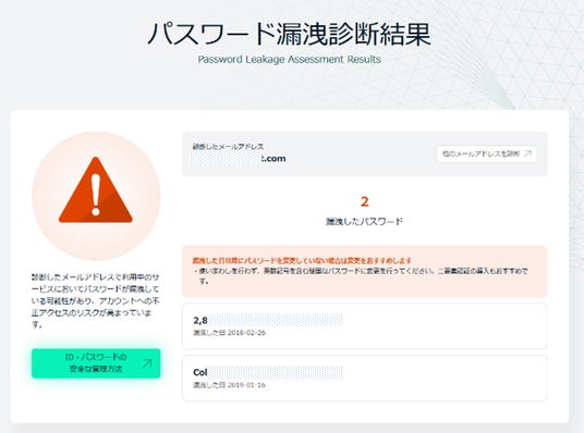 パスワードの漏洩が確認された場合は、その漏洩が発生した日時やサービス名も表示されます。