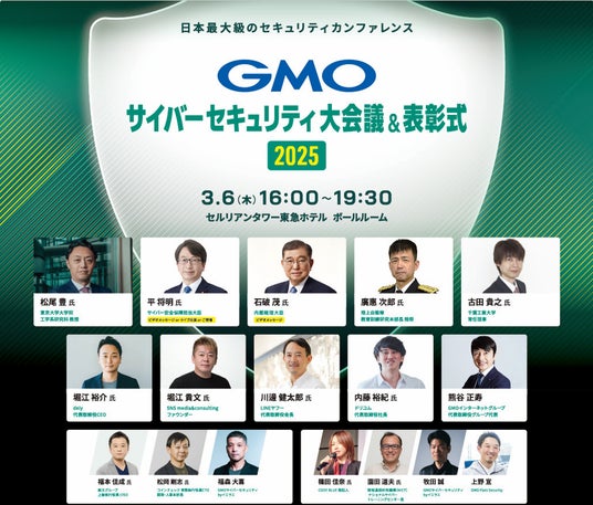 また、「ネットのセキュリティもGMO」プロジェクトの第2弾として、サイバーセキュリティ月間(2月1日~3月18日)の期間中である3月6日(木)に、「GMOサイバーセキュリティ大会議&表彰式2025 ~GMO Cybersecurity Award 2025を発表~」を開催します。日本最大級のセキュリティイベントを目指しており、各界の著名人による講演、サイバーセキュリティの専門家によるパネルディスカッションなどを実施します。また、イベント内では、2024年にサイバーセキュリティに多大なる貢献をされた方々の表彰も行い、サイバーセキュリティ業界を盛り上げることで、ネットのセキュリティに関する業界の強化に寄与いたします。
