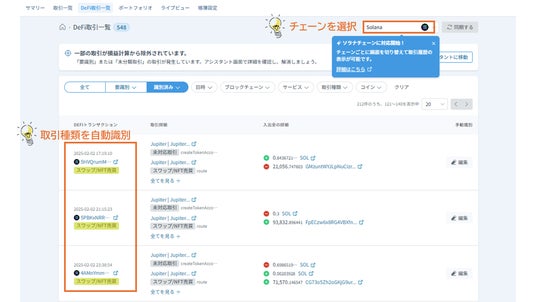 この手法により、従来のトランザクションの開始時点と終了時点の資産残高の差分を参照する方法と比較し、より正確な識別と損益計算を実現しました。1つのトランザクション内でスワップとステーキングが組み合わさっているような複雑な取引の自動識別にも対応可能となり、利用者は損益計算を効率的に行うことができます。DeFi機能の詳細および使い方についてはヘルプページをご参照ください。