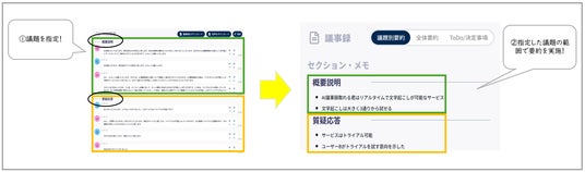 1.議題要約機能:文字起こしの結果に対し、指定した議題ごとに要約を行います。議題が登録されていない場合は、従来通り自動的に要約が生成されます。